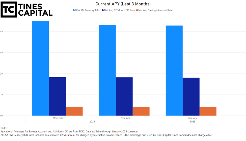 At Tines Capital, we believe that the best way to optimize cash that’s not needed for daily expenses is by investing in short-term U.S. Treasuries, which is debt backed by the U.S. government. These offer competitive yields, daily liquidity, and risks in line with a checking or savings account while often paying more than traditional savings accounts.